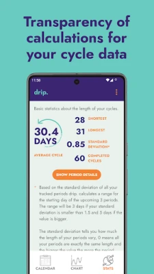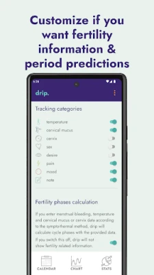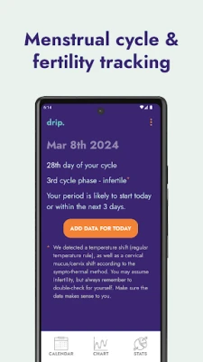 Menstrual cycle tracking can help you understand your body symptoms and gives you insights into your menstrual health. Use drip for tracking your menstrual cycle and for fertility awareness. Unlike other menstrual cycle tracking apps, drip is open-source and leaves your data on your phone, meaning you are in control.