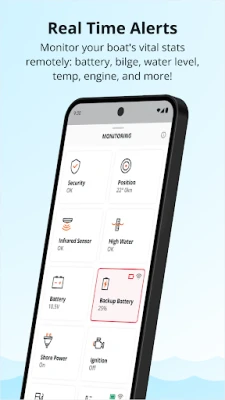• Monitor: Remotely monitor your boat’s battery, bilge activity, water level, temperature, engine performance, fuel consumption and more